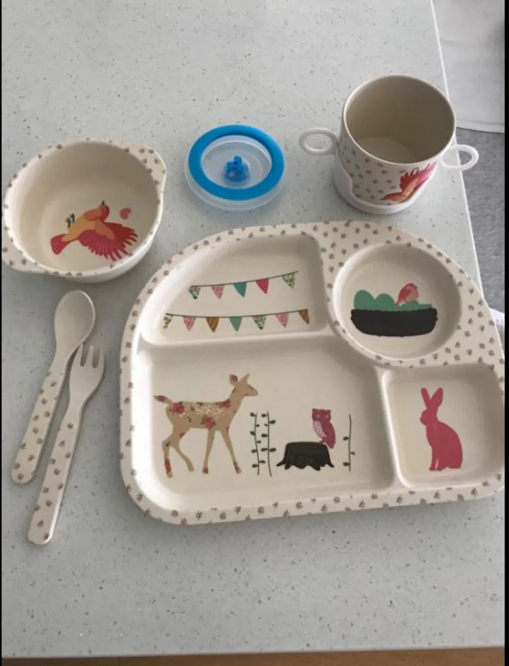 - 🍴 COMPLETE TABLEWARE SET - This kids dishware set contains 1 plate, 1 bowl, 1 cup, 1 spoon, 1 fork but also a removable cup holder and dust-proof cup cover designed for babies and toddlers.